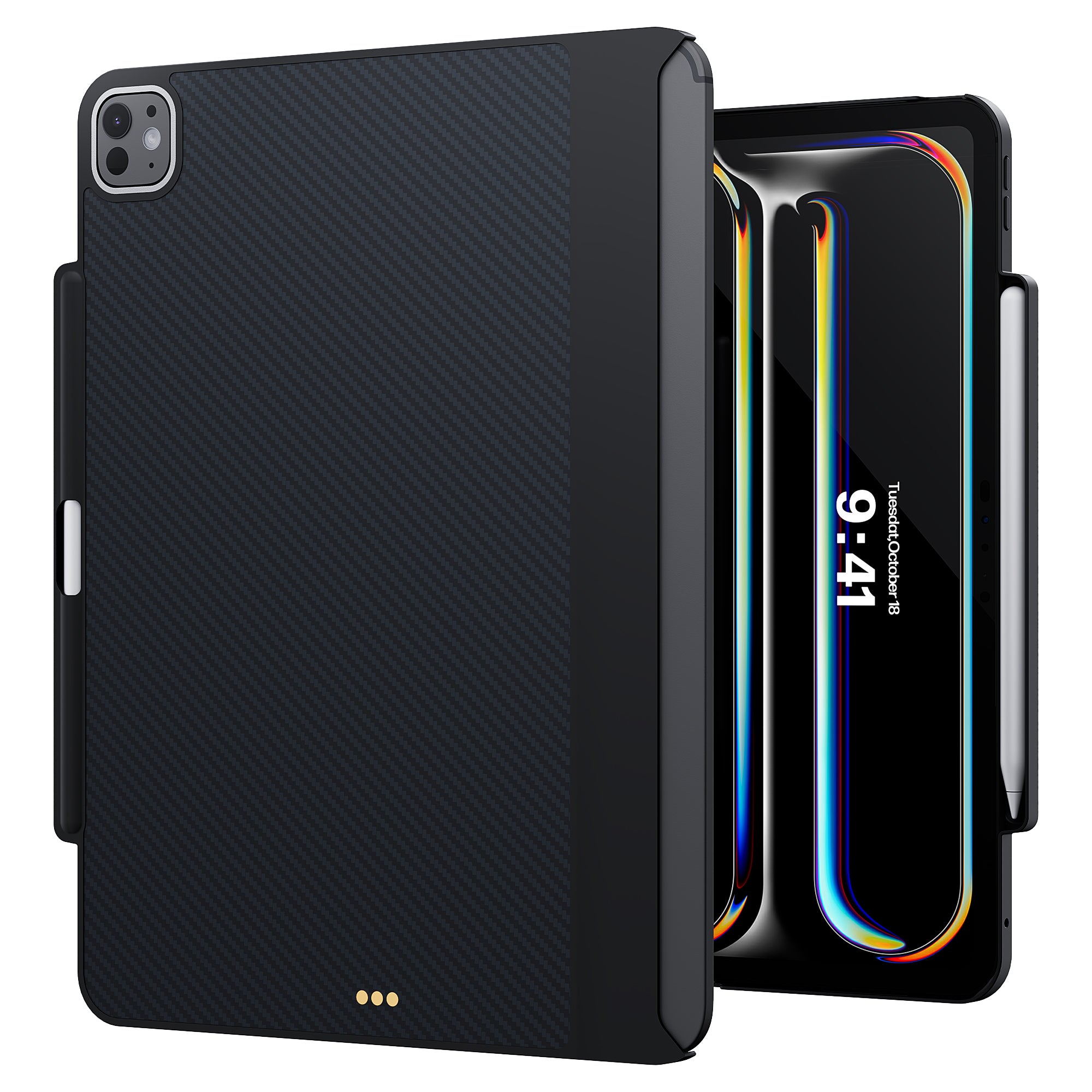 Upgrade your iPad Pro 13" (M4, 2024) with a premium protective case featuring a modern carbon fiber texture. The magnetic design ensures a secure fit and smooth attachment while remaining compatible with the Magic Keyboard for enhanced productivity. This case supports Apple Pencil magnetic charging and includes a built-in pencil holder for added convenience. Lightweight yet protective, it offers full coverage against scratches, scuffs, and everyday wear while keeping your iPad looking stylish and professional.