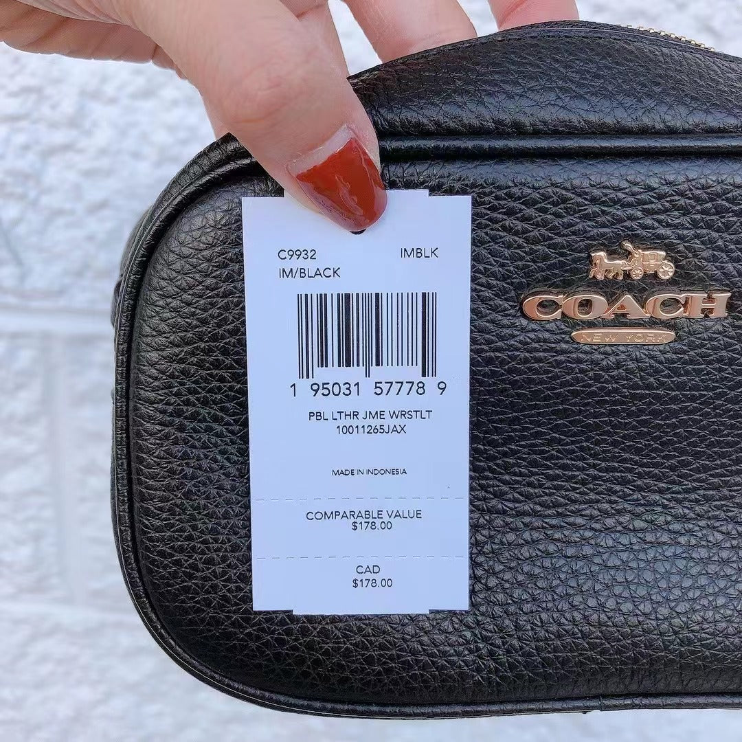Coach C9932 Jamie Wristlet In Gold/Black Refined pebble leather Two credit card slots Strap with dogleash clip attached 7" (L) x 4" (H) x 2" (W) Style No. C9932 UPC:195031577789 SKU: CO2675